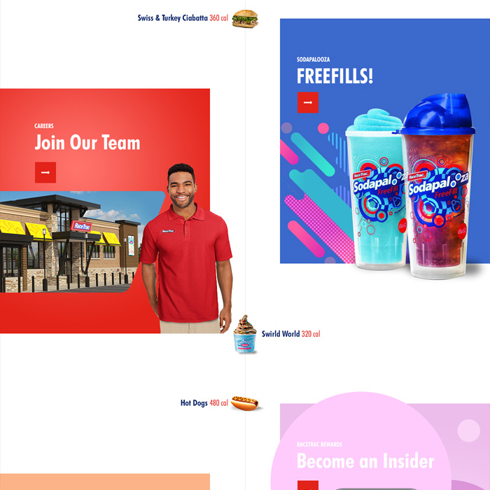 I reimagined the digital experience to mirror what it feels like to step into a RaceTrac. Playful illustrations, bold colors, and unexpected moments of delight brought the brand’s personality to life online—creating an engaging, vibrant journey that’s fresh, fun, and unmistakably RaceTrac.